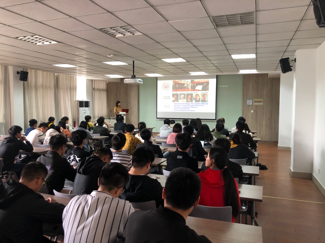 此次报告会由洪流副教授主持,会间吉庆敏教授主要向参加报告会的师生们介绍了她在富勒烯聚集体构效关系研究中取得的显著科研成果,并着重向在场师生详细介绍了其课题组在富勒烯溶液自组装领域取得的最新进展和突破。利用溶液法调控富勒烯自组装过程是制备富勒烯超分子结构的重要和主要方式。然而,由于分子间的强π-π作用,富勒烯分子在溶液中的自组装过程往往极快完成,因而难以实现对富勒烯超分子结构在纳米尺度上的微观调控。通过在富勒烯的溶液自组装过程中掺杂不同π系分子,能够实现对其聚集体在纳米结构特征上的调控以及功能化,并制备出具有不同结构特征的多孔碳结构,展现出强化的能源存贮和光电特性。同时,通过调控复合富勒烯在溶液中的自组装结构,对于富勒烯自组装机理也获得了进一步深入的解析。吉庆敏教授精彩的演讲引起广大师生的兴趣,现场反响热烈。会后,吉教授与在场的师生就相关学术问题进行了热烈的讨论与交流。