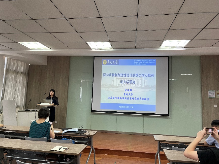 顾志国副院长对吉远辉教授的来访致以热烈的欢迎,8X8X 众多师生参加了报告会。吉教授首先简述了“十四五”规划中,重点推进医药工业由大向强转变的战略目标,阐明了医药产品高端化的重要性与紧迫性;其次,针对目前药物制剂开发过程的诸多挑战,提出包括深入剖析释药机理、精准调控释药速率的全新设计理念,以打破技术壁垒,实现从“跟跑”到“领跑”的飞跃。报告中,吉教授将工作分为三个部分进行介绍:1、药物/聚合物/溶剂体系的热力学相行为;2、药物释放动力学模型研究;3、理论基础研究指导药物复合制剂的制备。吉教授团队在工作中建立了可有效预测实际药物释放的数据模型,及包含101种药物、48种溶剂、75种辅料溶解度数据库,可指导药物复合制剂的制备。