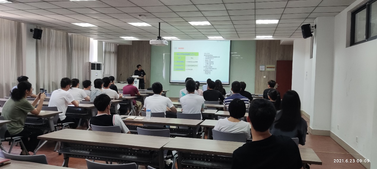 众多师生参加了报告会。邓教授首先介绍了他们研究团队采用材料数智化设计的研究方法,接着介绍了他们团队“材料基因组计划”的核心是以材料设计为中心,利用大规模并行计算,大数据分析,并行化材料组合合成等技术手段,来设计合成新型功能材料、主要在锂离子电池、合金、热电、光电及CO2捕获材料以及药物合成等。报告中,邓教授主要介绍了他们团队材料与药物设计方面的几个案例:1、常温常压下CO2转化材料;2、孔富集效应材料;3、单原子催化材料设计合制剂的制备以及药物设计方面的工作。邓教授团队在工作中建立的材料数智化设计的研究方法,可以有效筛选材料,这不仅缩短了高效材料的合成时间还降低了成本,为高效材料的合成提供了强有利的指导。