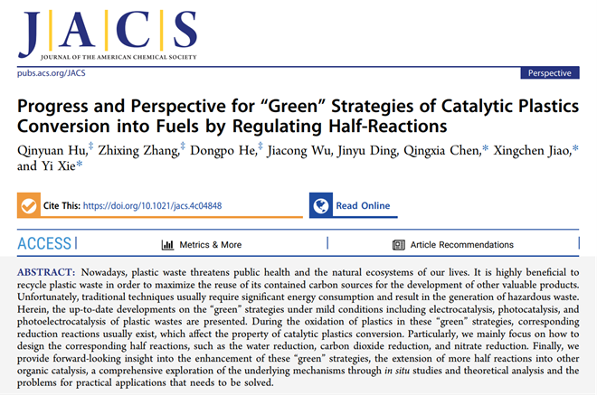 焦星辰教授、陈庆霞副教授与中国科学技术大学谢毅院士合作,在温和条件下塑料催化转化方面发表重要观点论文,相关工作在“J. Am. Chem. Soc.”上发表:Progress and Perspective for “Green” Strategies of Catalytic Plastics Conversion into Fuels by Regulating Half-Reactions。J. Am. Chem. Soc.每年发表论文3千余篇,其中仅20篇左右是由主编亲自邀请各重要前沿分支的领军学者,就领域性进展和前瞻撰写的Perspective文章,其对学科发展的重要意义和权威性不言而喻。该论文化工学院2022级硕士研究生胡秦源、2023级硕士研究生张志兴和2023级博士生何东坡为共同第一作者。