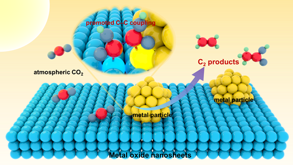 示意图1.负载在金属氧化物半导体纳米片上的高活性金属颗粒实现光还原大气浓度CO2制C2燃料的示意图。