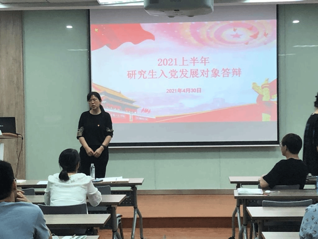 首先,吕淼等13名发展对象依次上台进行个人展示,表明了自身入党动机的转变,展示了研究生阶段以来思想上对党的认识以及为此付诸的行动和努力。在思想上,同学们经过发展对象培训班、原著原文、文史资料等积极学习掌握党的历史,表达了自身的殷切学习之心;在工作上,他们积极帮助同学,参加志愿活动。最后,所有同学也都反思了自身不足之处,提出了对于自身缺点的改进方向。发展对象们表示将会按照党员标准严格要求自己,努力在学习、工作和生活中做出成绩,自觉向党组织看齐,坚持为人民服务。
