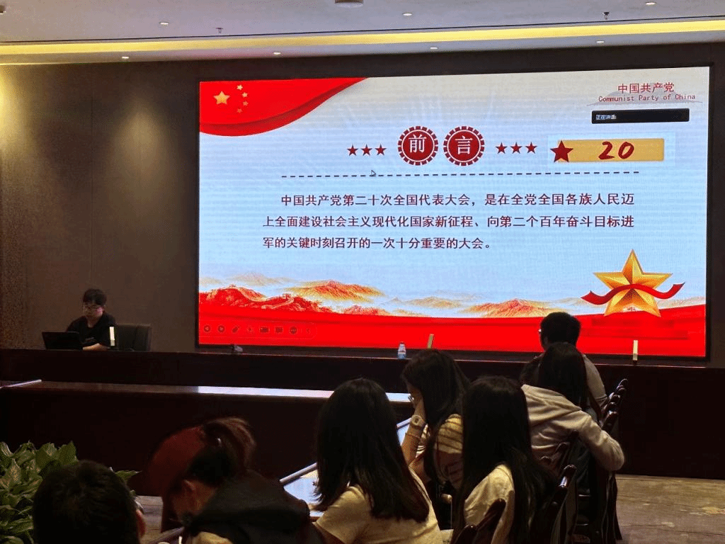 东氿校区国际交流中心报告厅开展“学理论、悟思想、强党性”理论学习活动。本次活动由辅导员李晓洁主持,2022级研究生党支部全体党员参加。