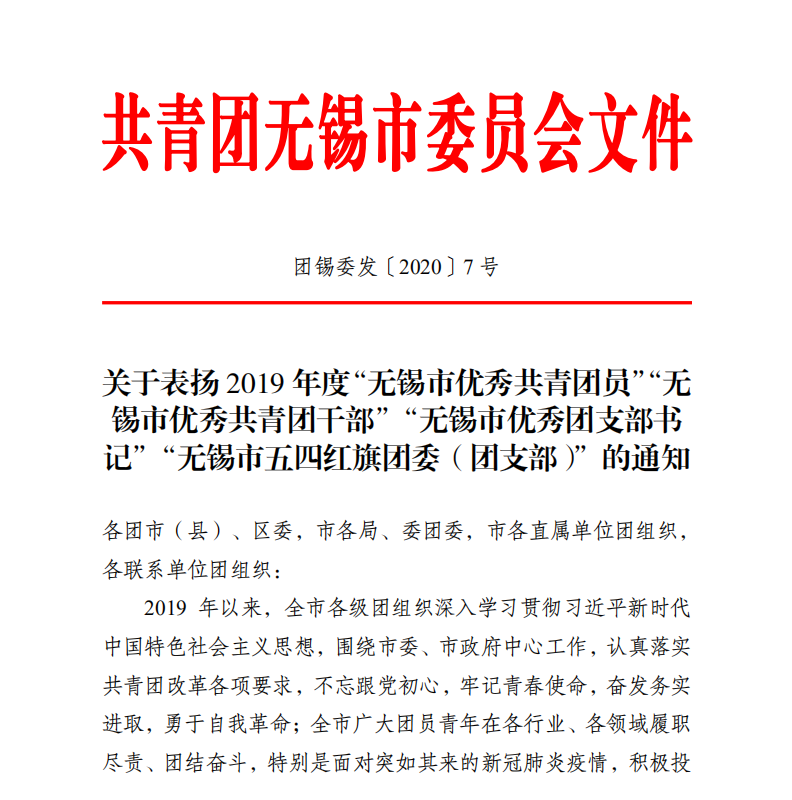 近日,共青团无锡市委员会发布《共青团无锡市委员会关于表扬2019年度“无锡市优秀共青团员”“无锡市优秀共青团干部”“无锡市优秀团支部书记”“无锡市五四红旗团委(团支部)”的通知》,共青团8X8X