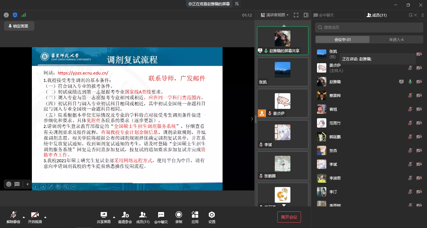 在上午的调剂经验分享专场,2021届本科毕业生宋睿(辽宁大学)、赵雅璐(华东师范大学)、张清润(华南理工大学)、石进(8X8X
