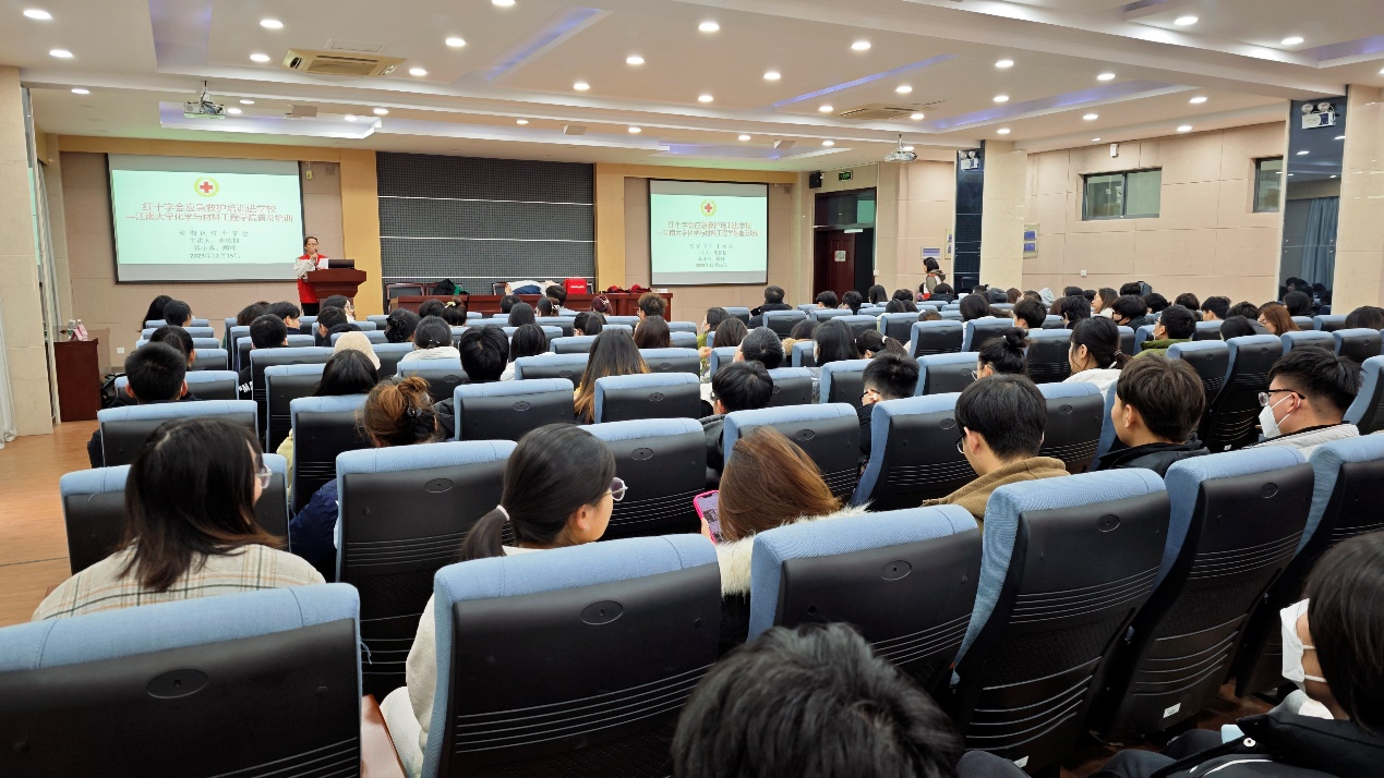 此次讲座特邀了红十字会救护培训师、无锡市红十字赈济救援队副队长唐镇棣主讲,红十字会救护培训师蒋小燕、助教老师顾瑾现场协助。讲座通过对急救知识的讲解、急救情况视频播放和现场带领学生实际演练等方式,全面介绍了救护相关法律法规、应急救护流程以及日常意外和急症的救护原则。