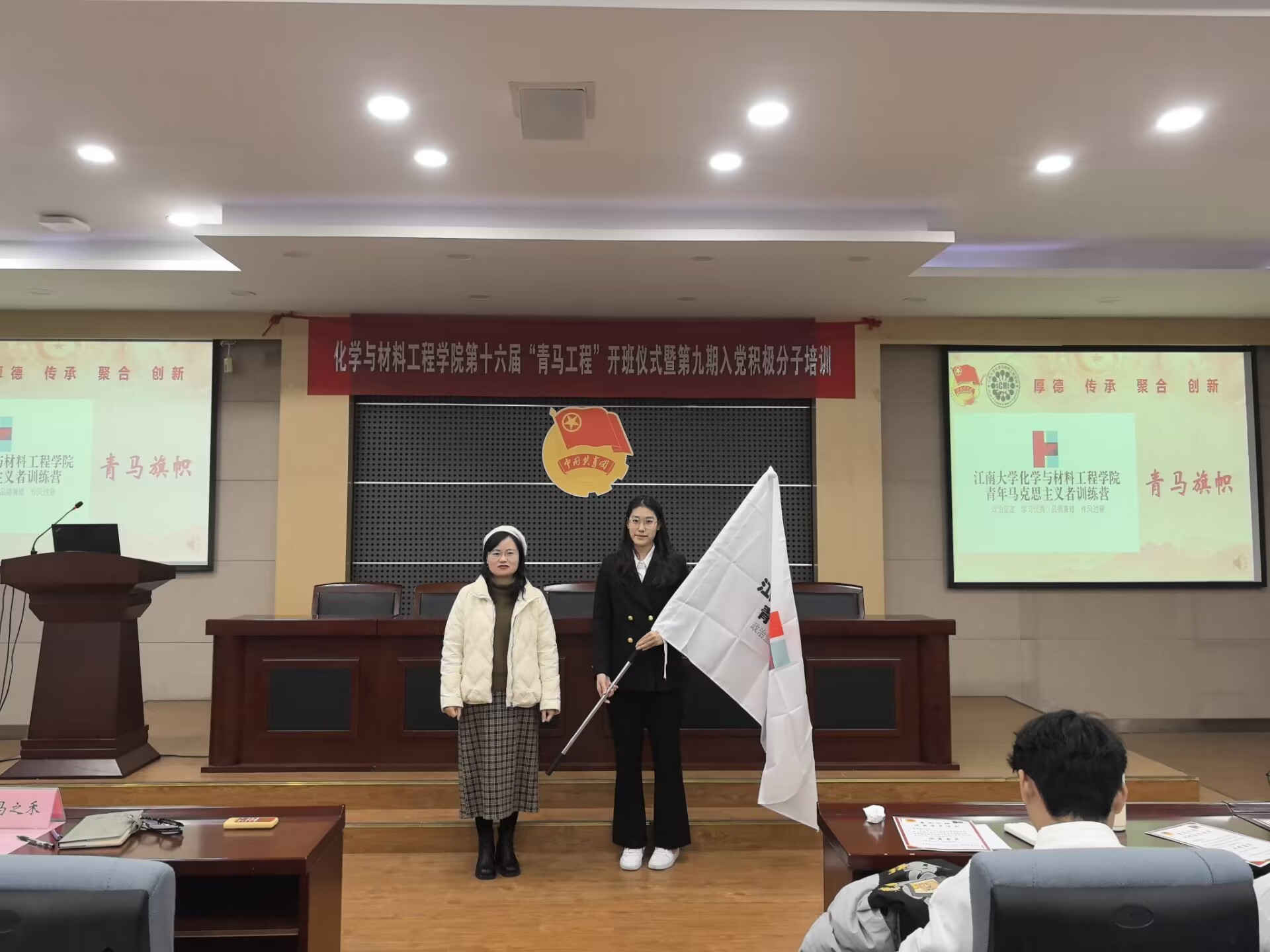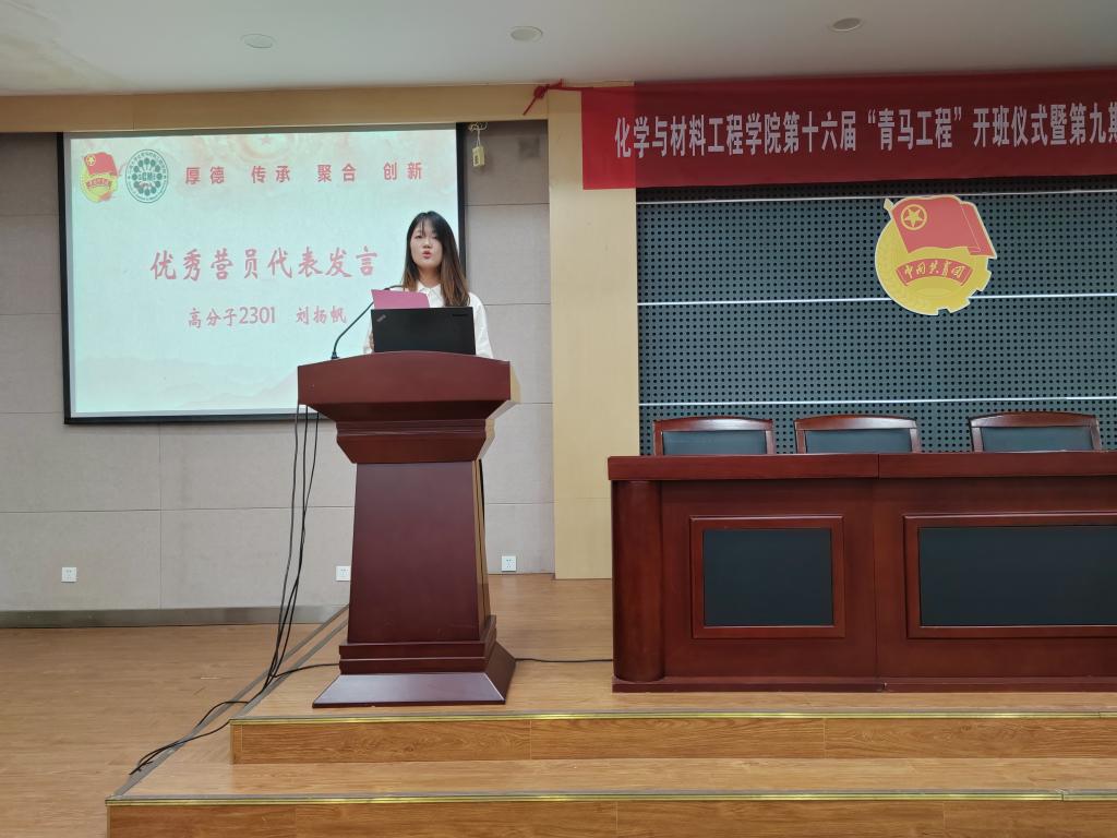 紧接着,董霞为第十六届“青马工程”培训班授旗,新学员代表高分子2402班朱思盈同学上台发言,承诺将在本次培训班中努力学习,提升自我,继续学习好、传承好、发扬好党的红色精神,努力成为一名坚定的青年马克思主义者。