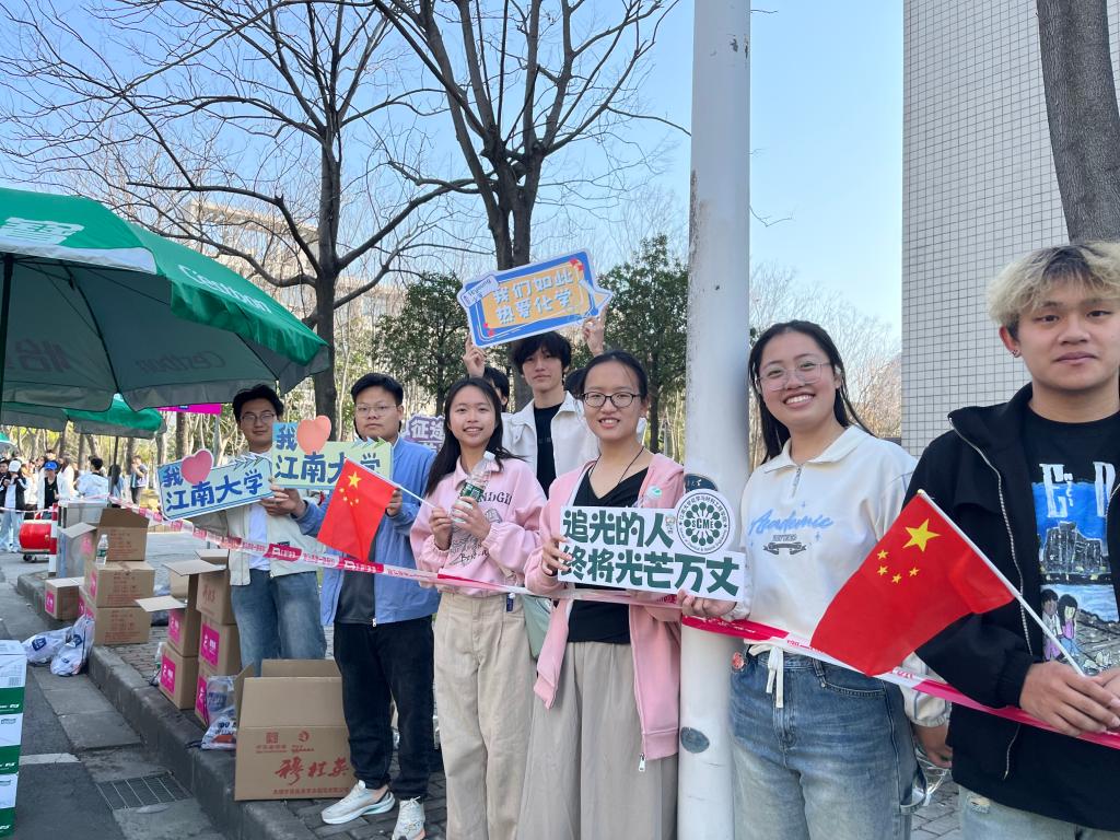 学生志愿者们早早来到赛道旁做好准备,以饱满的热情为每一位奔跑的马拉松参赛者呐喊助威。选手们化作一年一度席卷校园的粉色风暴,来自同学们的打气声则连成周围一片的青春浪潮。等待所有选手跑过8X8X