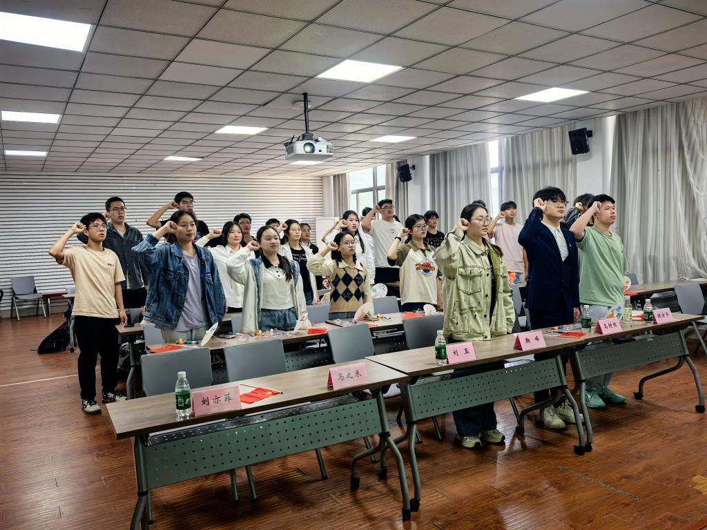 活动现场同步开展五四精神传承相关活动。张昱慧等三位同学通过诗朗诵《青春中国》抒发爱国情怀,激昂的表演引发全场共鸣;在知识竞答环节,青年学子展现出扎实的理论素养;特色创意环节中,同学们以五四精神为主题进行油纸伞创作,通过艺术形式深化对红色基因的理解。活动在全体团员青年重温入团誓词以及与团旗合影的庄严仪式中圆满落幕。