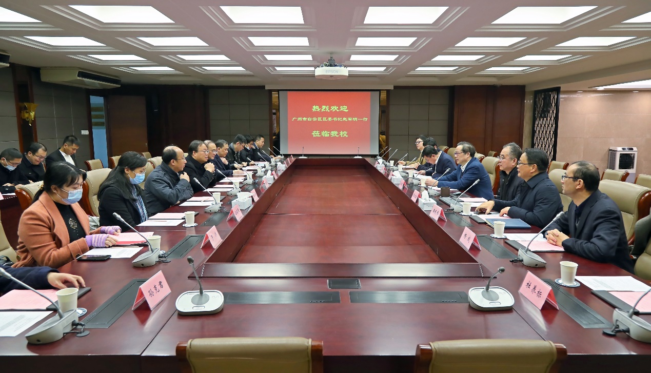 1月22日上午,广州市白云区委书记赵军明、区委副书记潘志军、副区长蔡胜以及白云区各部门主要负责人一行15人来校推进“8X8X