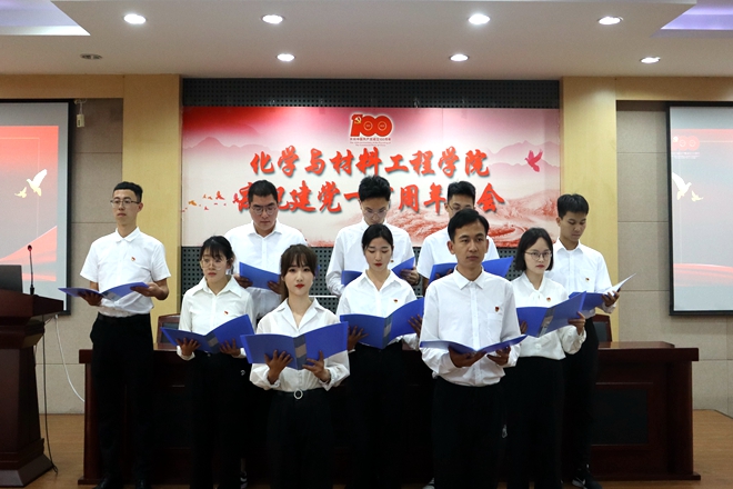 庆祝建党一百周年大会暨2021年“七一”入党宣誓仪式在学院B329会议室举行。化工学院党委书记潘庆伟、院长东为富,校纪委监督检查室主任魏静,学院全体党委委员,学院全体受表彰师生优秀党员、优秀党务工作者及示范性基层党组织代表,全体师生党支部书记、学生党员,全体新发展学生党员参加了活动。活动由学院党委副书记田卫平主持。