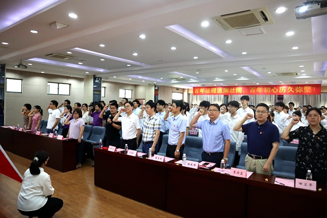 会上,学院党委副书记田卫平同志带领全体党员师生共唱《国际歌》。随后,真材实料研究生党支部进行了开场诗朗诵《红船,从南湖启航》,带领全体党员重温中国共产党成立的伟大历史。院党委书记潘庆伟同志郑重宣读学院优秀党员、优秀党务工作者、示范性基层党组织表彰文件并授予证书。东为富院长宣读新发展预备党员名单,并由全体党委委员、教工党支部书记为全体预备党员授予党徽。院学工办主任刘凡同志带领全体党员面向党旗郑重宣誓。