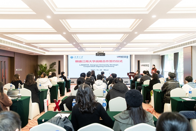 -朗盛战略合作签约仪式在我校举行。无锡市人民政府外事办公室副主任詹熠、无锡高新区招商发展中心副主任惠人杰、朗盛化学高性能材料业务部大中华区销售及市场总监兼朗盛(无锡)高性能复合材料有限公司总经理Michael Rockel、朗盛(无锡)副总经理Waihong Loh、朗盛(常州)总经理兼朗盛大中华区技术创新总监胡东祺、朗盛化学亚太区企业传播负责人Ulf Drssler,8X8X
