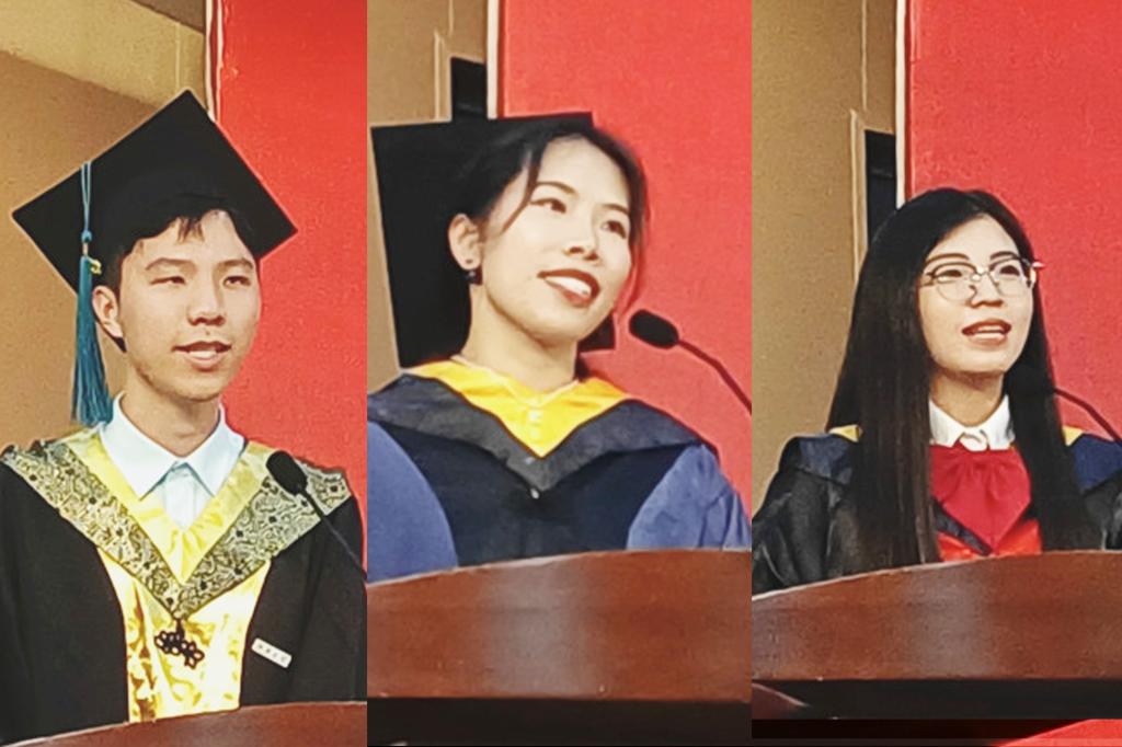毕业生代表高分子1803班祝晗旭、化学工程与技术2019级茅沁怡、化学工程与技术2018级梁雪分别代表本硕博毕业生发言,讲述了各自与学院四年、七年和九年的缘分与情谊,表达了对母校、对学院、对老师的感恩之情,对踏上人生新征程的坚定信心。