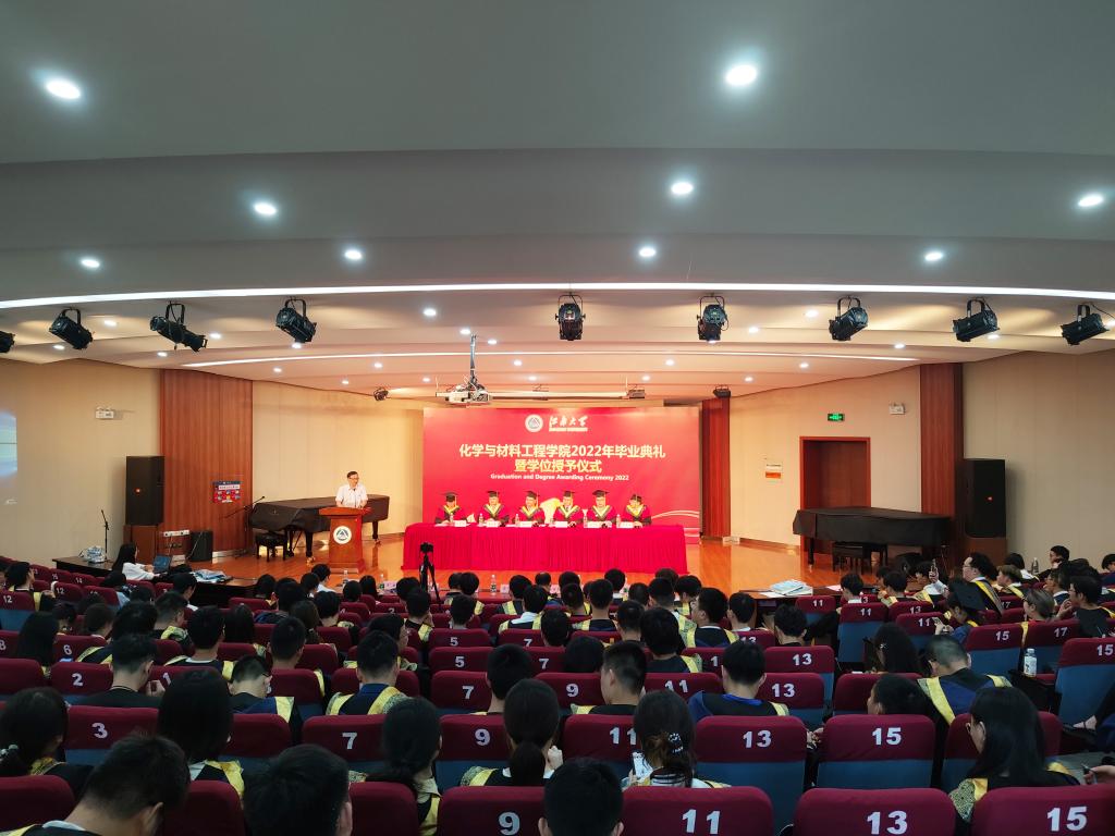 在北区大学生活动中心举行2022年毕业典礼暨学位授予仪式。学院党委书记潘庆伟,院长东为富,副院长董玉明、顾志国、马丕明,化工系蒋平平教授,全体系主任、辅导员、毕业班班主任,学院2022届本硕博毕业生欢聚一堂,共同迎接这个具有特殊意义的重要时刻。典礼由学院党委副书记、副院长田卫平主持。