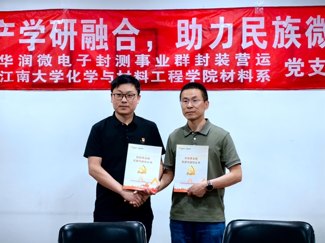 材料系党支部与华润微电子封测事业群封装营运党支部在华润安盛科技有限公司第一会议室举行党建结对共建签约仪式,以党建为桥梁推动校企深度合作,服务教育强国建设,为民族微电子产业高质量发展注入新动能。化工学院党委书记潘庆伟、华润微电子封测事业群党委书记费锐,双方党支部党员代表及业务骨干参加签约仪式。