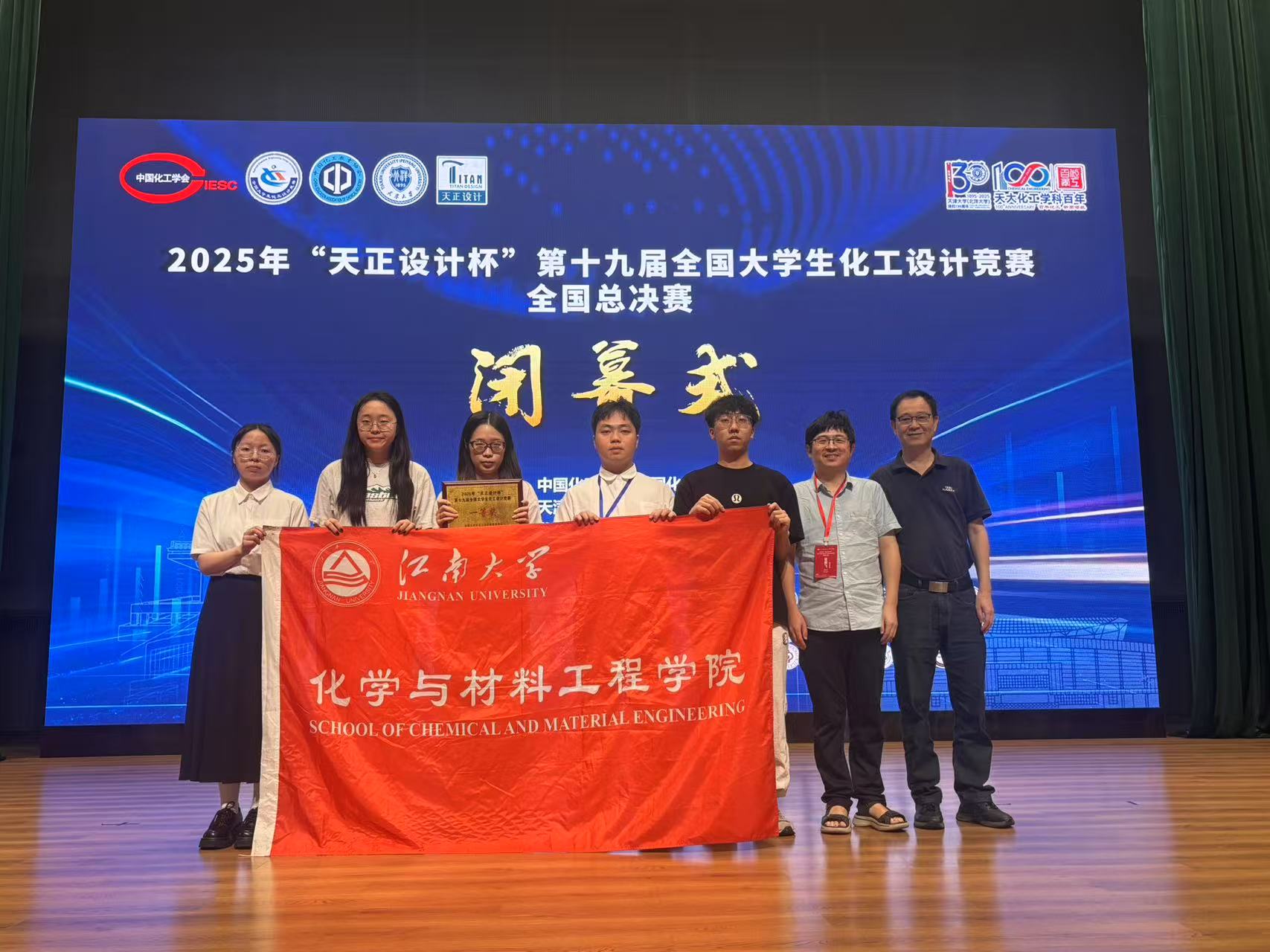 “极净之砜”队的作品《中国石化茂名石化公司年产2万吨DMSO项目》(参赛队员:赖炜键、刘利坤、曾诺恒、王怡敏、刘婷;指导老师:钮腾飞、倪邦庆、张薇、章佳威)历经江苏省省赛、华东赛区选拔赛和全国总决赛的激烈角逐,以及五位队员在答辩现场的优异表现,最终获江苏省特等奖(铜奖)、华东区特等奖以及全国一等奖。