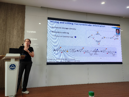 A316学术报告厅做了一场题为“Sequence-defined macromolecules: From synthesis to applications(序列定义大分子:从合成到应用)”的学术报告,会议由黄晶副教授主持。Nezha Badi博士以聚合物合成的发展历程为研究背景,主要围绕序列定义大分子的精准合成与功能应用展开系统性阐述。她以序列定义大分子的规模化制备作为核心切入点,重点介绍了其团队在提升合成效率与规模方面的创新方法,通过精确控制大分子的链长、端基与拓扑结构,充分发挥序列定义大分子在结构精准度与功能设计性方面的独特优势,使其在防伪技术、生物模拟及信息存储等领域展现出广阔的应用前景。这些研究为推进序列定义大分子走向实际应用提供了可行路径。此次全英文报告会吸引了众多师生积极参与,现场学术氛围浓厚。