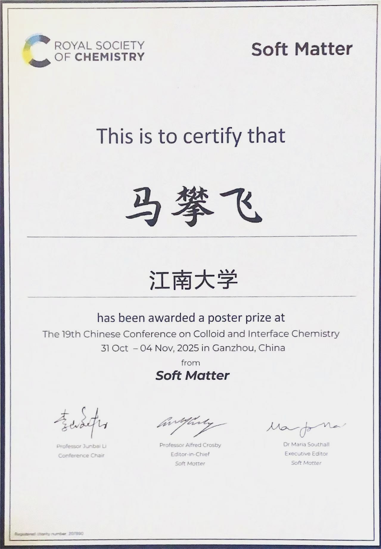 依托合成与生物胶体教育部重点实验室,在胶体与界面化学领域形成了特色鲜明、优势突出的研究体系。此次马攀飞同学荣获RSC优秀墙报的荣誉,不仅是研究成果在全国性学术舞台上精彩亮相,更彰显了8X8X