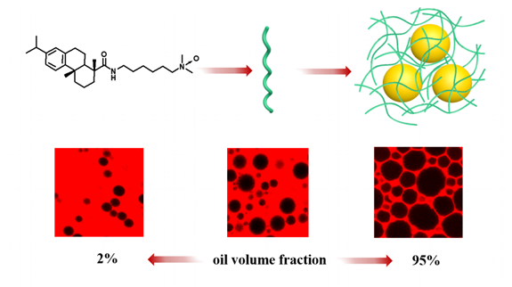 新合成的氧化胺型表面活性剂R-6-AO引入了来自松香的脱氢枞酸作为疏水基的一部分。R-6-AO不仅具有表面活性,而且是一种高效的小分子水凝胶剂,其临界胶凝浓度仅为0.18 wt%,每个分子可以固定13,888个水分子。它们在水溶液中自组装形成直径约为10 nm的左手螺旋纤维,通过升温-降温过程再构成凝胶网络结构,最低仅需0.2 wt%的浓度即可构建油相体积分数在2%至95%之间任意变化的O/W型凝胶乳液,适用于多种油相如各种烃类和天然油脂等。另一方面,本研究对松香(一种可再生林业资源)的深加工和改性、促进松香在高新技术领域的应用也具有重要意义。