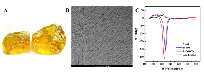 图1(A)松香;(B)5 mM R-6-AO凝胶Cryo-TEM图像;(C)R-6-AO和R-COONa在不同环境中的CD光谱图