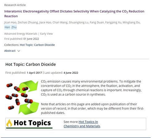 化工学院杜明亮教授团队在面向碳中和高效催化转化材料的设计与应用方面取得重要进展,课题组2018级博士生郝继璨以第一作者在Advanced Energy Materials上发表重要学术论文:“Interatomic Electronegativity Offset Dictates Selectivity When Catalyzing the CO2Reduction Reaction(Adv. Energy Mater. 2022, 2200579)”,通讯作者为朱罕副研究员。同时,该工作被欧洲化学会旗下期刊ChemSusChem作为Hot Topic(Carbon Dioxide)重点报道。