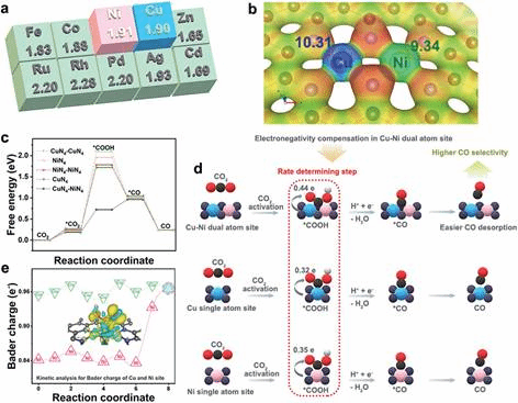 对比单原子催化剂,双单原子(DSA)催化剂具有更为丰富的原子配位环境及元素组合选择性,被广泛应用于电催化CO2还原反应(CO2RR)研究。现阶段,大量研究将DSA催化剂的活性来源简单归因于DSA间的协同作用,限制了DSA催化剂的进一步发展。因此,DSA间电荷作用的可视化及其在电催化还原CO2过程中的反应动力学行为对于CO2RR的深入机理研究至关重要。针对这一问题,课题组基于金属原子电负性的理论分析,提出一种DSA电负性补偿的概念及实验方法。该研究以理论计算为导向,选取具有相似电负性原子Cu (电负性1.90),Ni (电负性1.91)构建CuN4-NiN4双单原子模型,理论分析表明Cu与Ni两者间存在的电荷补偿效应能够产生显著的电荷重排,所提出的CuN4-NiN4构型相较于单原子位点表现出更低的反应能垒。