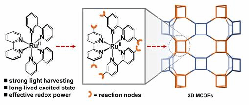 三联吡啶Ru(II)及其衍生物是经典的光敏分子,具有强可见光吸收、高氧化还原能力和长激发态寿命。具有多面体几何构型的Ru(II)配合物适合于构筑3D MCOFs(图1)。得益于MCOFs的晶态特征,Ru(II)光敏单元可以被精准地均匀定位于框架结构中,有效促进光吸收和电子转移。此外,3D结构的贯通孔道更加有利于活性位点的暴露、促进底物的扩散。