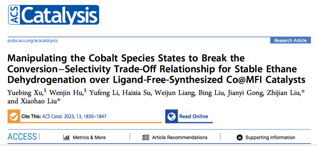 近日,我校化工学院刘小浩教授团队在开发非贵金属催化乙烷无氧脱氢高效制乙烯的研究中取得重要进展,研究成果以“Manipulating the Cobalt Species States to Break the Conversion-Selectivity Trade-Off Relationship for Stable Ethane Dehydrogenation over Ligand-Free-Synthesized Co@MFI Catalysts”为题发表于催化领域顶级期刊《ACS Catalysis》上(DOI: //doi.org/10.1021/acscatal.2c05860)。该论文8X8X
