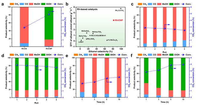 实验、表征和理论计算结果表明:(1)Rh-N3P1位点在催化CO2加氢制乙醇的反应中具有优异的催化性能(TOF=420.7 h-1),优于绝大多数文献报道结果。(2)Rh-N4位点对甲醇表现出高选择性(91.3%),通过简单的磷取代(Rh-N3P1)不但大幅增加了反应活性,而且实现了反应产物从甲醇到乙醇(81.8%)的可切换合成。(3)Rh-N3P1位点上优异的CO2反应活性和乙醇选择性可归因于Rh-P位点对的存在,其中P原子对CH3OH*中的O原子表现出强亲和力,P的强给电子能力削弱了C-O键,有利于CH3*的形成以及随后的CH3*和CO*之间的C-C偶联形成乙醇。相比较而言,Rh-N4位点难以有效活化解离C-O键,因此产物以甲醇为主。本工作为CO2加氢高活性、高选择性合成乙醇提出了全新的位对(Site Pair)催化体系,强化了双位点之间的协同催化作用,为指导设计其它高效位点对催化体系,从而解决反应过程中存在的问题提供了新的思路。