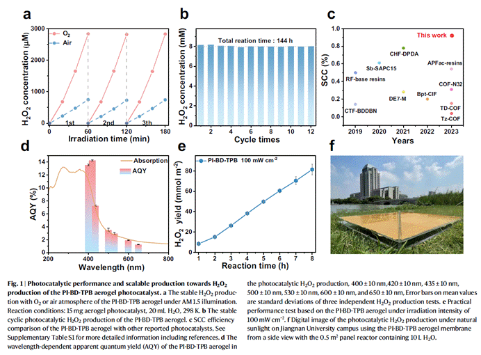 图1:聚酰亚胺气凝胶的光催化性能和规模化制备双氧水的潜力