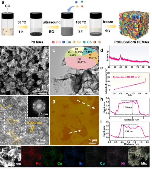 图1.PdCuSnCoNi高熵金属烯气凝胶的形貌和结构表征