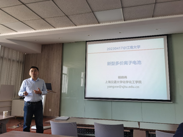 随后,杨晓伟教授以“新型多价离子电池”为题,首先介绍了以镁、锌为代表的多价金属离子电池体系在储能领域的研究进展以及存在的挑战与难点。随后,从分子层次的溶剂化离子结构调控、单元层次的复杂界面传递过程解耦,到系统层次的电池器件组装等三方面出发,介绍了其团队相关研究成果。最后,杨晓伟教授针对水系锌离子电池的锌负极界面稳定性,揭示了影响电池安全性及稳定性的制约因素是锌离子-水偶极作用引发的析氢反应,并且提出了有效的解决方法。此次报告引起了老师和同学们的积极讨论,拓展了师生们的科研思维,并且营造了浓厚学术研讨氛围。
