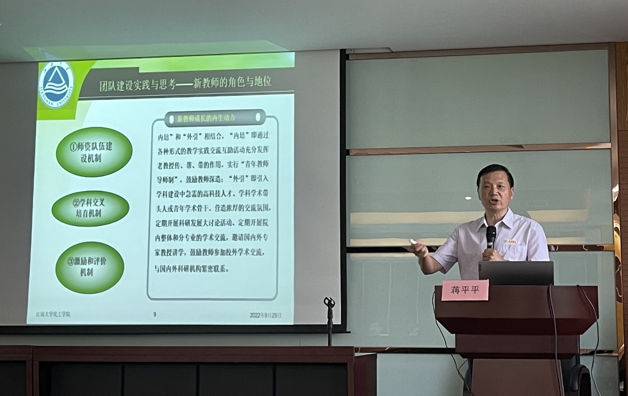 本次交流活动围绕青年教师教书育人、教学与科研和在团队中成长等方面展开,三位特邀专家为大家带来了精彩的报告。同济大学杜建忠教授的报告题目为:“青年教师如何做更好的科研”。他将科学研究分为三种类型:“前无古人,后有来者”、“前有古人,后无来者”、“前有古人,后有来者”。他结合自身开拓“以糖控糖”新领域的经历,强调了青年教师选择研究领域的重要性。他希望,各位青年教师要具备战略性思维,充分发挥自身潜能,结合团队和学科发展需要,做“有组织”的科研。化工学院蒋平平教授以“敬业与奋进,责任与奉献”为主题,阐述了科研团队的内涵与本质、新教师的角色与地位。他提出,青年教师要勇于追求“学院首次”,在知识多元化、学科交叉化趋势加强的背景下,珍惜学院氛围,加快融入团队,实现合作共赢,在成全学生的同时成就自己。8X8X